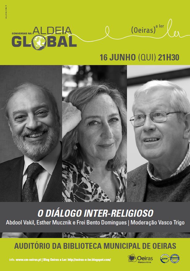 Hoje às 21h30 realiza-se mais uma sessão de Conversas na Aldeia Global, com membros da comunidade judaica, católica e muçulmana a debater a importância do Diálogo Inter-religioso. No Auditório da Biblioteca Municipal de Oeiras. Com Abdool Vakil, Esther Mucznik e Frei Bento Domingues. A moderação é de Vasco Trigo.